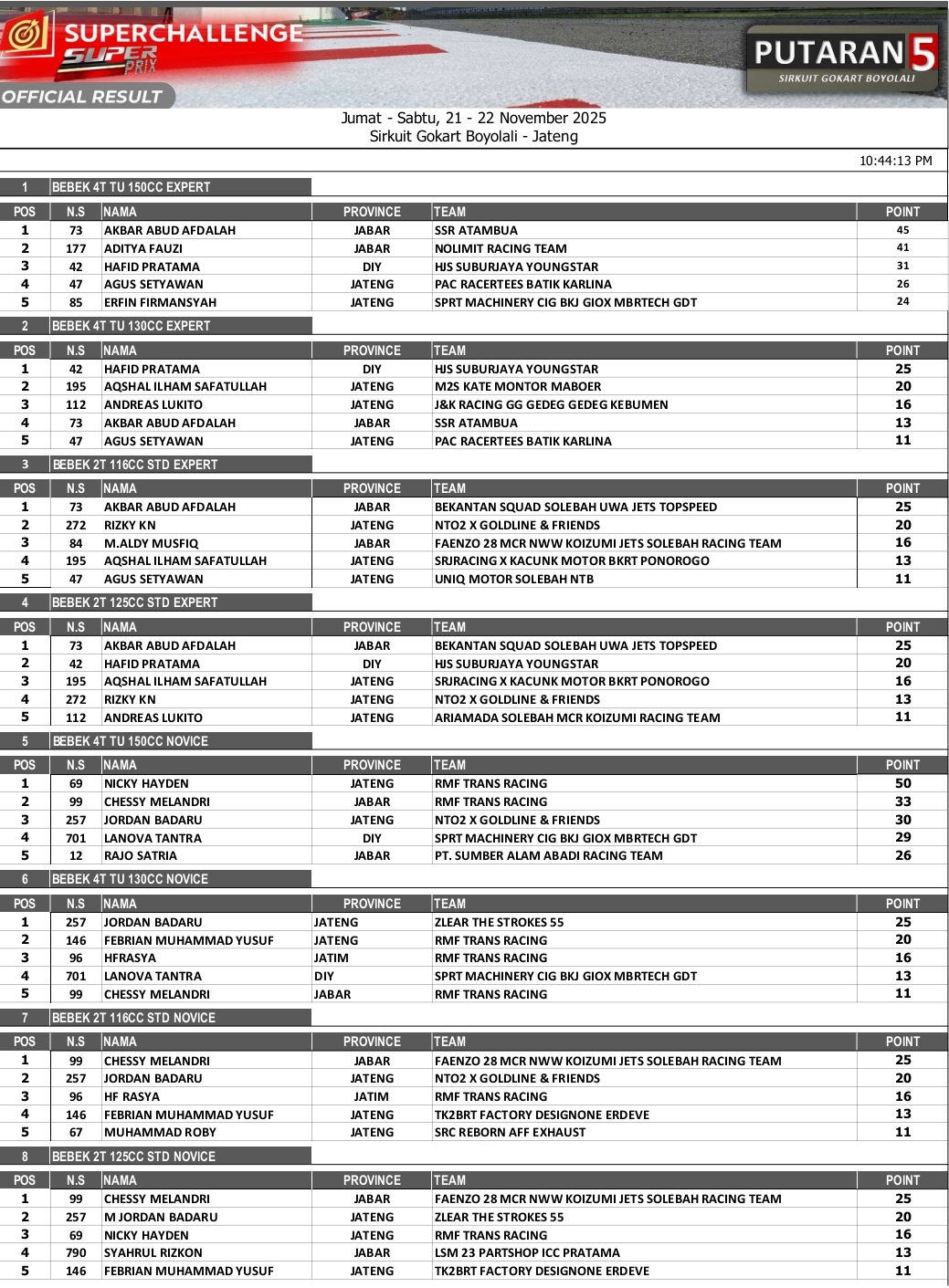 NewsRacing Hasil Lengkap Final Superchallenge SuperPrix 2025 Boyolali Penulis Yudha - 23 November 2025 FacebookTwitterPinterestWhatsApp Otocorner.com- Berikut merupakan hasil lengkap final Superchallenge SuperPrix 2025 persembahan Genta Auto & Sport di sirkuit Gokart, Boyolali (21-22/11). OC1