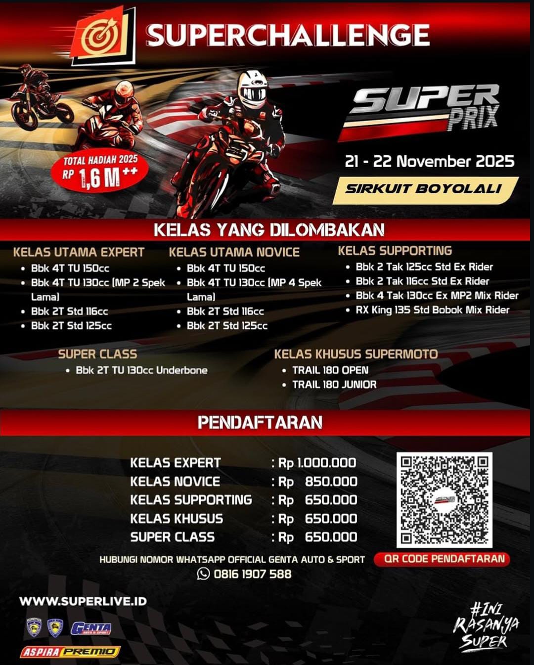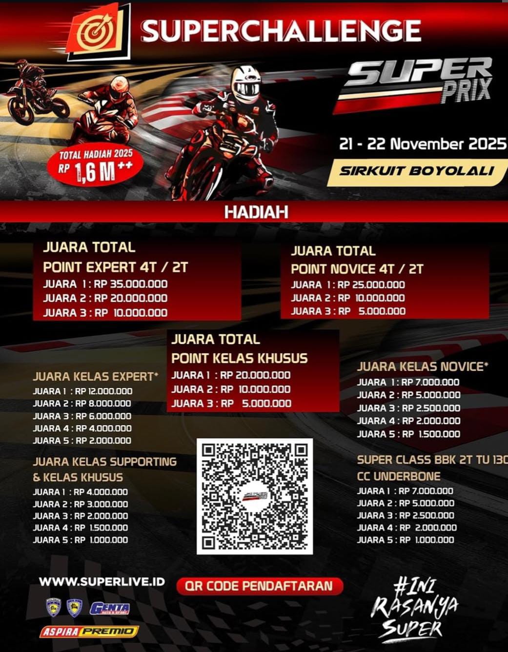 Otocorner.com- Musim panjang Superchallenge Superprix 2025 akhirnya tiba di titik puncak. Putaran kelima yang sekaligus menjadi ronde penentuan ini bakal digelar di Sirkuit Boyolali, Jumat–Sabtu, 21–22 November 2025.